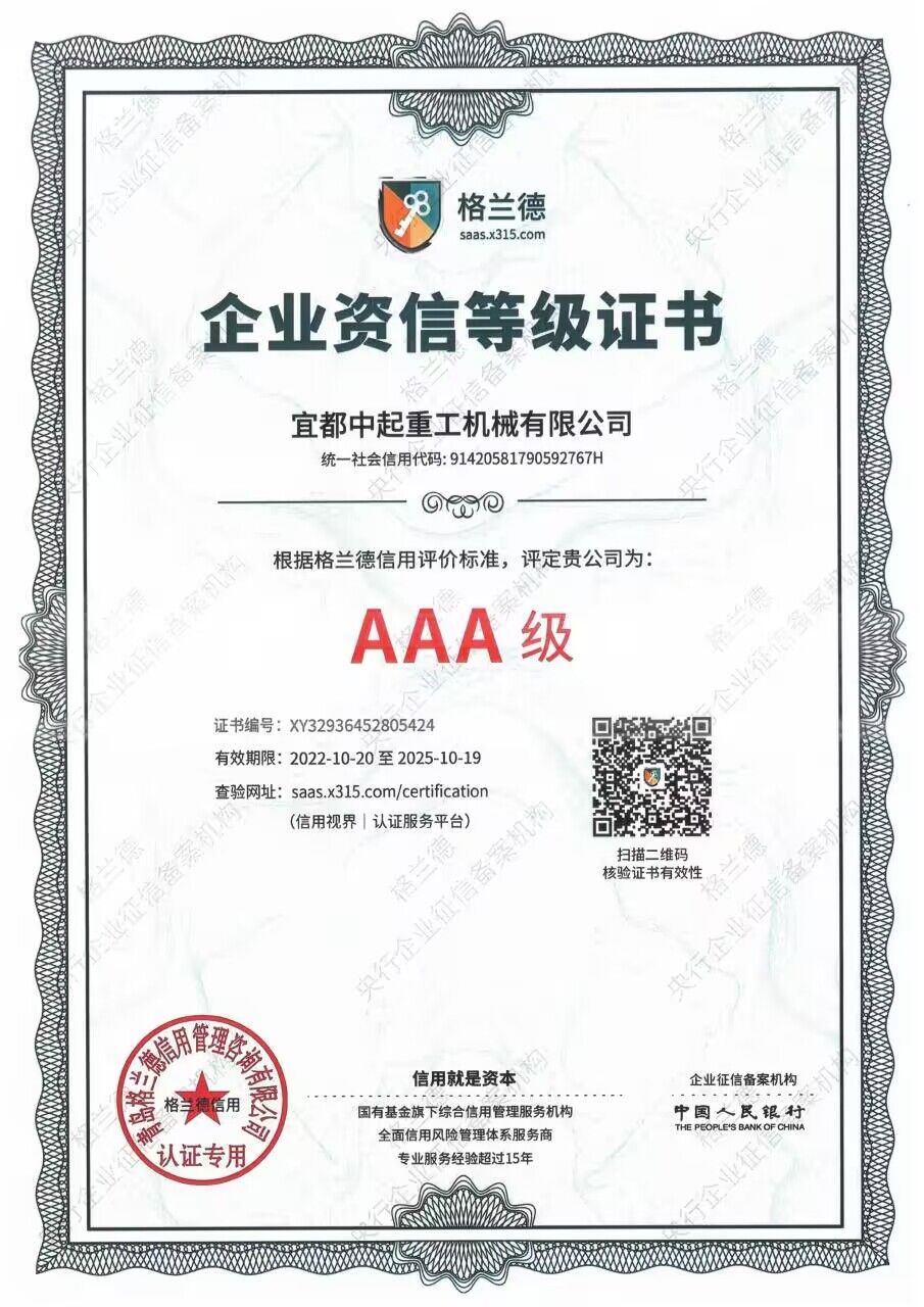 2022年宜都中起重工機(jī)械有限公司被格蘭德信用評價為AAA級企業(yè)。